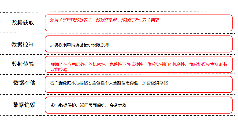 此项重点强调金融客户端密码算法以及密钥管理,对密码算法、密钥长度都做了相关的要求,其中密钥的生成、传输、存储应具备随机性和机密性。