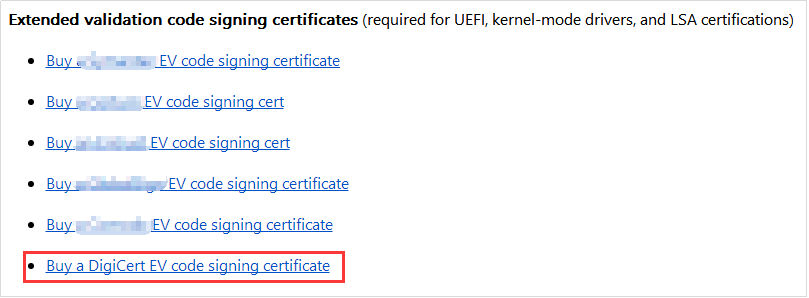 但是,WHQL 仅对驱动程序包目录文件进行签名,不会将签名嵌入驱动程序文件,微软发布签名的证书也不包含开发者的身份认证信息。因此,开发者将驱动程序提交WHQL认证之前,必须先使用已认证开发者身份的EV代码签名证书对驱动程序进行数字签名。开发者可通过微软推荐的证书颁发机构获取EV代码签名证书。