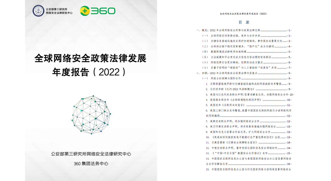 发布日期:2023-02-17近日,公安部第三研究所网络安全法律研究中心与 360 集团法务中心联合共同发布了《全球网络安全政策法律发展年度报告(2022)》。《报告》概览2022年全球网络安全形势与政策法律态势,并对2023年及后续短期内网络安全政策、立法趋势进行研判。下载报告全文>>