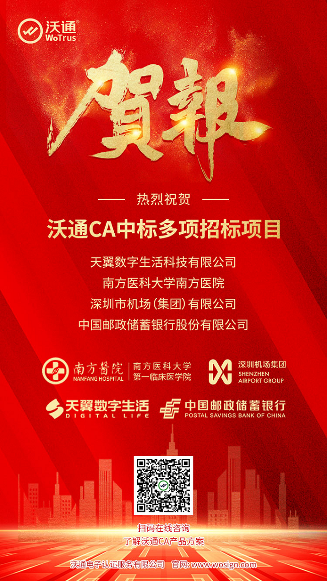 本批中标项目中,沃通CA凭借优质产品、专业服务能力、合规资质及良好的信誉,从众多厂商中脱颖而出,为天翼数字生活、南方医科大学南方医院、深圳机场集团、中国邮政储蓄银行等多家政企单位提供SSL证书、代码签名证书等类型的数字证书产品。