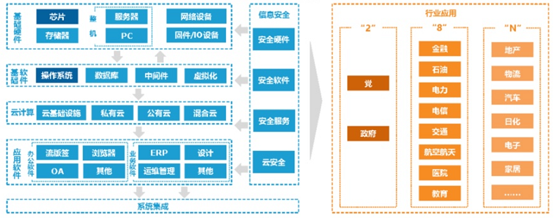 在行业应用方面,国家曾制定了“2+8+N”的信创三步走战略:“2”就是首先实现机关范围内的国产替代,同时顺带打磨产品、培育骨干企业; “8”指的是金融、电信、电力、石油、交通、航空航天、教育、医疗8大关键行业。在产品相对好用、生态比较成熟后,信创将扩大到8大关键行业; “N”就是其他行业,最终将信创产品扩展到全行业。