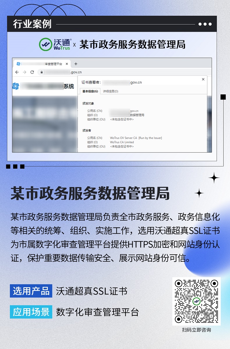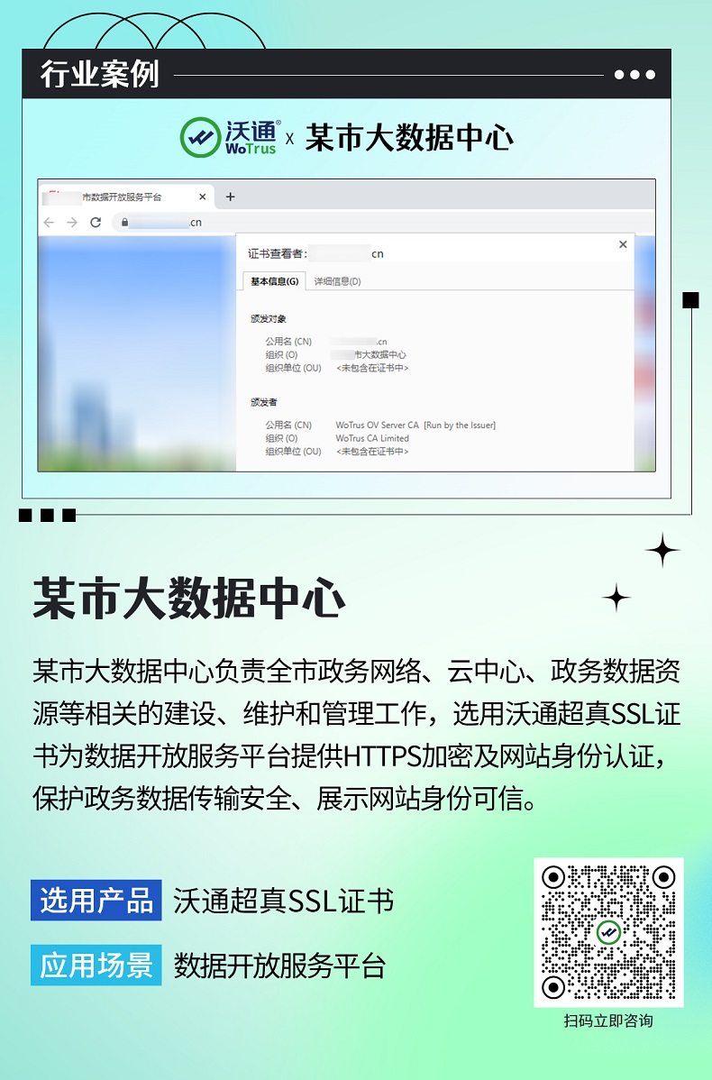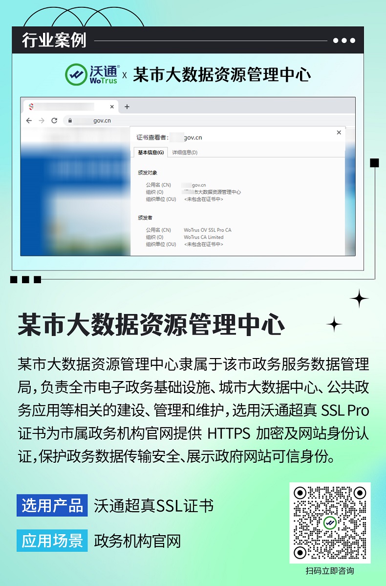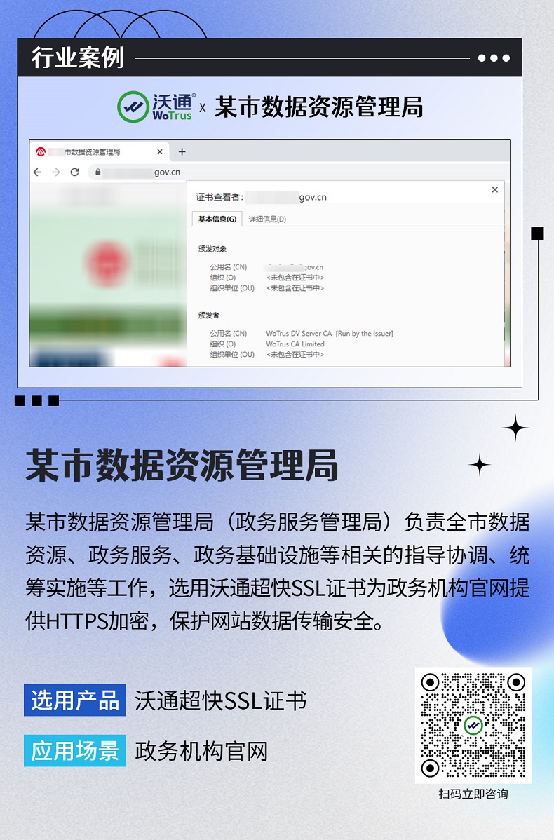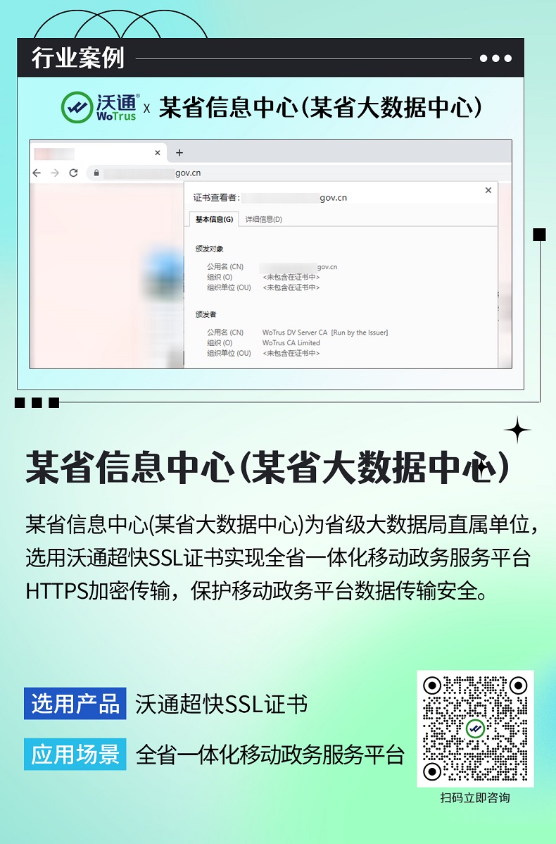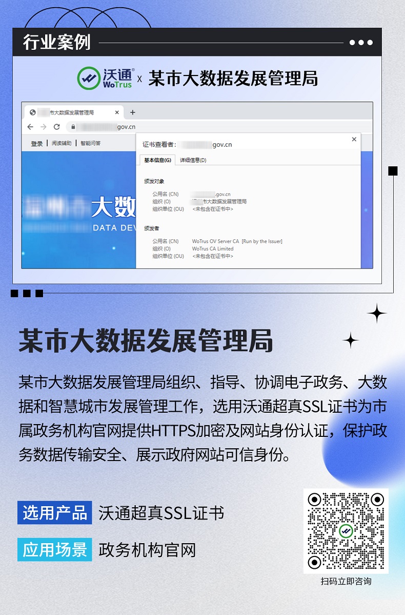 目前,我国多省市政务数据管理机构选用沃通SSL证书,应用于政务机构官网、在线政务系统、移动政务APP等各类电子政务场景中,实现数据传输安全及通信主体身份认证,保护政务数据安全。