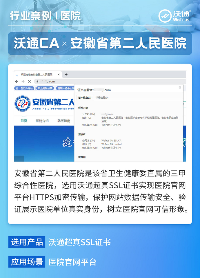 安徽省第二人民医院是安徽省卫生健康委直属的三级甲等综合性医院,选用沃通超真SSL 证书实现医院官网平台HTTPS加密传输,保护网站数据传输安全、验证展示医院单位真实身份,树立医院官网可信形象。