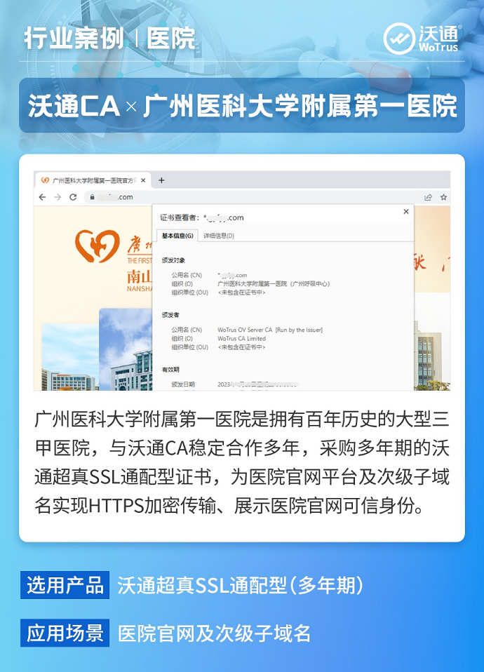 广州医科大学附属第一医院是拥有百年历史的大型三甲医院,与沃通CA稳定合作多年,采购多年期的沃通超真SSL通配型证书,为医院官网平台及次级子域名实现HTTPS加密传输、展示医院官网可信身份。