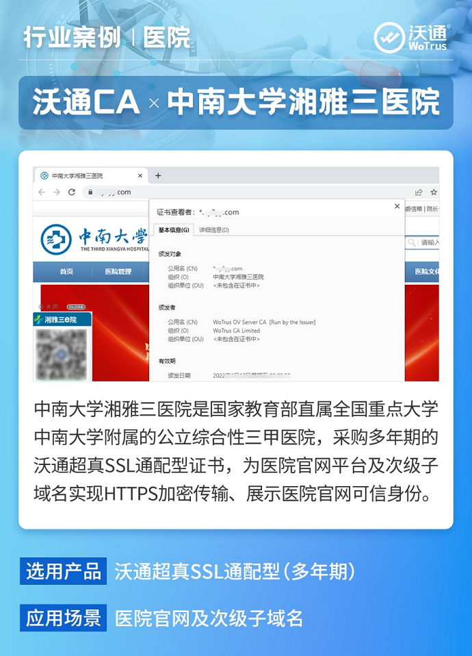中南大学湘雅三医院是国家教育部直属全国重点大学中南大学附属的公立综合性三甲医院,采购多年期的沃通超真SSL通配型证书,为医院官网平台及次级子域名实现HTTPS加密传输、展示医院官网可信身份。