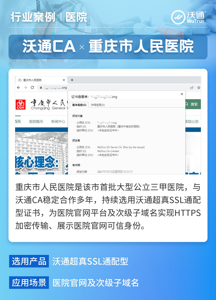 重庆市人民医院是重庆市首批大型公立三甲医院,与沃通CA稳定合作多年,持续选用沃通超真SSL通配型证书,用于医院官网平台及次级子域名实现HTTPS加密传输、展示医院官网可信身份。