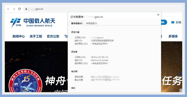 中国载人航天工程官方网站是承载中国载人航天工程相关信息权威发布的官方平台,具有重要建设意义。为积极落实遵循《网络安全法》、《数据安全法》等法律法规对网络安全、数据安全的建设要求,确保网站数据传输安全及官网的权威可信,中国载人航天工程官网通过招投标形式采购SSL证书加密服务,实现网站数据传输加密和网站可信身份认证。沃通CA以优质产品、合规资质及完善的服务体系,在此次激烈投标比选中拔得头筹。目前,沃通SSL证书产品已经在中国载人航天工程官网及相关网站系统中部署应用,维护传输数据的完整性、保密性和真实性,防止数据泄露或被窃取、篡改,保障网站数据安全。