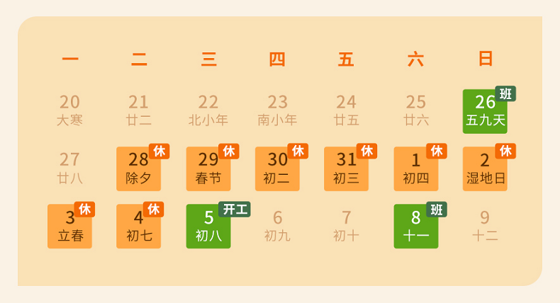 - 1月26日(周日)、2月8日(周六)按国家规定正常上班。
