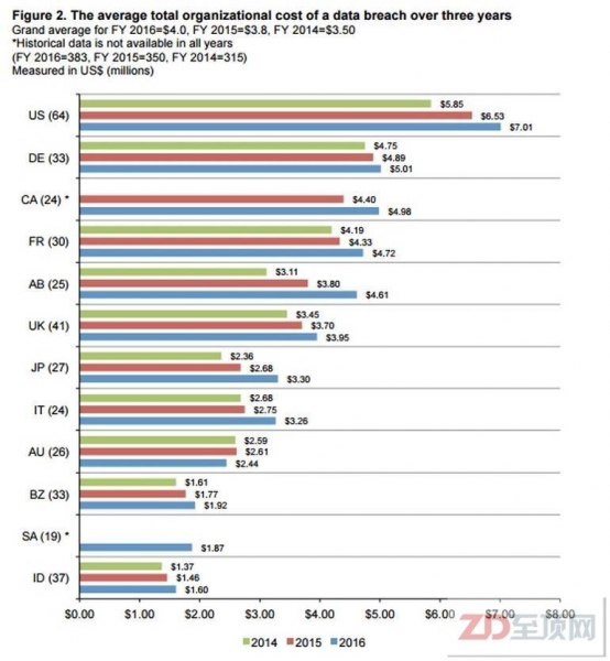 2、美国每次数据泄露的平均成本为701万美元。而在印度每次数据泄露的平均成本为160万美元。