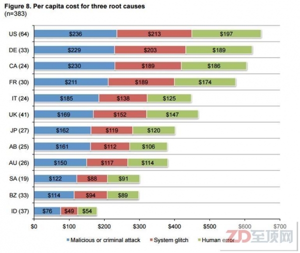 1、在美国的数据泄露成本最高,每项资料记录的平均成本为223美元,德国每项资料记录的平均成本为213美元。巴西和印度每项资料记录的平均成本最低,分别为100美元和61美元。