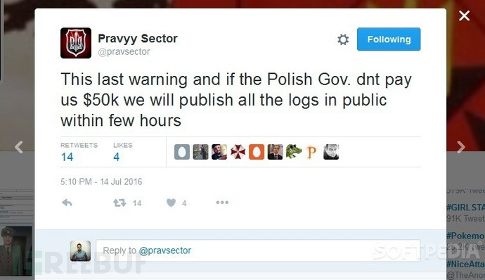 发布日期:2016-07-27一群自称“Pravyy Sector”(右边界)的黑客在推特上勒索波兰政府,如果波兰政府不通过乌克兰银行账户或者比特币支付50000美元的赎金,他们将会公开从波兰国防部窃取的机密数据。