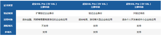目前市面上的主流SSL证书可分为三大类,DV SSL证书(域名验证型)、OV SSL证书(企业验证型)、EV SSL证书(扩展验证型)。