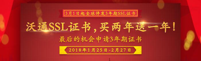 新规将至:“沃通SSL证书,买两年送一年”大优惠 2018年3月1日起,全球停发3年期SSL证书。新规将至,沃通CA推出SSL证书 “买两年送一年”大优惠!想申请3年期SSL证书,这是最后的机会啦!活动时间:2018年1月25日—2月27日。 |