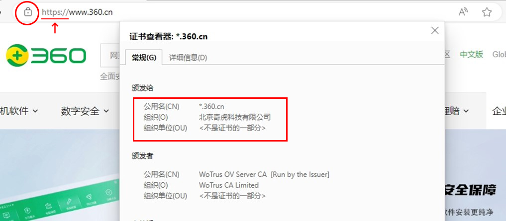 点击安全锁标志,“查看证书”就能此类证书的 “ 详细信息 ” – “ 主题 ”, 主题中显示 O 字段 (O 就是 Organization , O 字段用于显示单位名称 ),如下图所示: