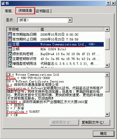 如下图所示,可以看出:比一般的代码签名证书多了 Phone、Description、Street和PostalCode字段。