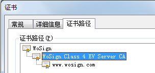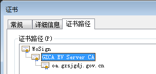 同 WoSign “数字证书商店”不同的是:超管 CA 系统签发的证书都是从政府自己专用的中级根证书签发,而不是同其他证书一样从 WoSign 中级根证书签发,如下图所示,左边为普通用户购买EV SSL 证书的证书链,其中级根证书为 WoSign Class 4 EV Server CA ;而右边为超管 CA 政府版用户 ( 如: 广州评测中心 ) 签发的EV SSL 证书链,其中级根证书为政府机构专用中级根证书 ( 如:GZCA EV Server CA ) :
