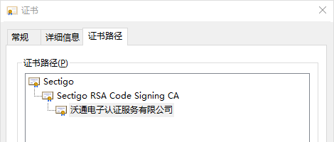 如下图所示为单位代码签名证书,颁发根证书为:Sectigo RSA Code Signing CA,证书主题中“O”字段(Organization)会显示申请单位的中文名称。