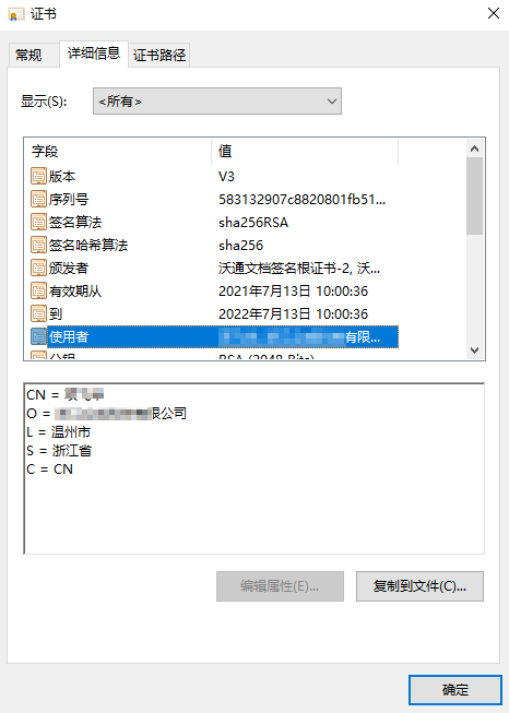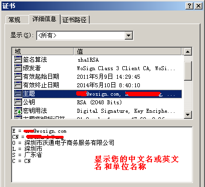 超真单位数字证书(ZhenOCC)显示填写的姓名、Email、单位名称、省市和国家,如下图所示: