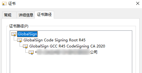 | 颁发根证书 | GlobalSign--GlobalSign Code Signing Root R45—GlobalSign GCC R45 CodeSigning CA 2020 |
