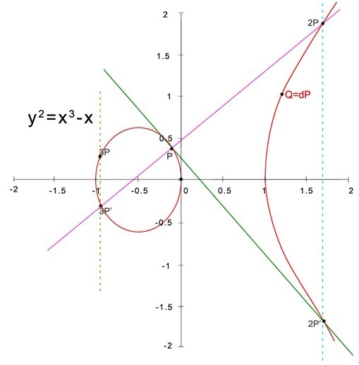 在椭圆曲线算法中,将倍数d做为私钥,将Q做为公钥。当然,椭圆曲线算法还有更严格的计算过程,相对图示要复杂的多。
