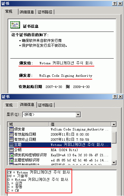 如下图2所示,以WoSign代码签名证书为例,CN(Common Name,公用名称)、OU(Organizational Unit,单位部门名称)、O(Organization,单位名称)、L(Locality,所在城市)、S(State/Province,所在省份)等都支持朝鲜语(韩文):