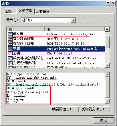 如下图4所示,以WoSign客户端单位证书为例,CN(Common Name,公用名称)、OU(Organizational Unit,单位部门名称)、O(Organization,单位名称)、L(Locality,所在城市)、S(State/Province,所在省份)等都支持阿拉伯语: