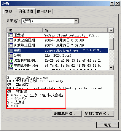 如下图3所示,以WoSign客户端单位证书为例,CN(Common Name,公用名称)、OU(Organizational Unit,单位部门名称)、O(Organization,单位名称)、L(Locality,所在城市)、S(State/Province,所在省份)等都支持日文: