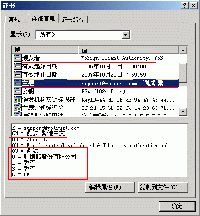 如下图5所示,以WoSign客户端单位证书为例,CN(Common Name,公用名称)、OU(Organizational Unit,单位部门名称)、O(Organization,单位名称)、L(Locality,所在城市)、S(State/Province,所在省份)等都支持繁体中文: