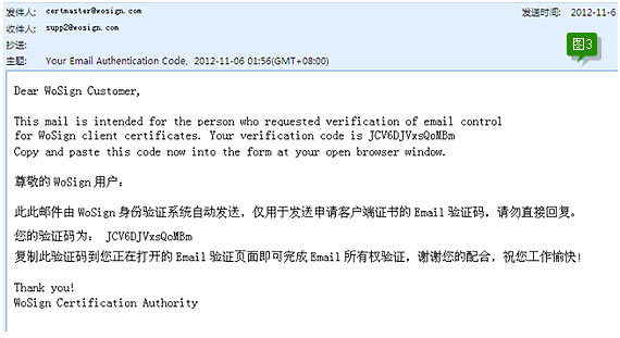 此时您申请证书的邮箱还会收到一封来自WoSign带验证码的邮件,邮件内容如下图3所示页面: