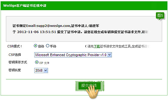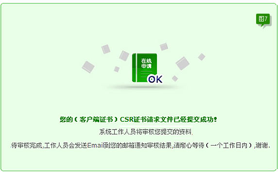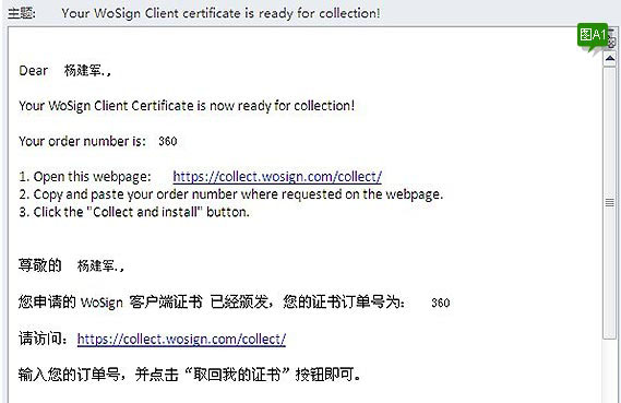 以上表示CSR提交成功。Wosign收到您的CSR,审核通过后签发证书,证书签发后,会发一封通知邮件到您的邮箱,邮件的内容如下图A1所示:
