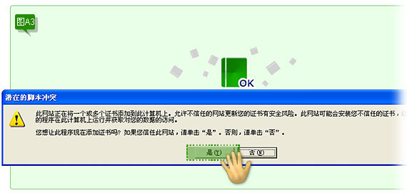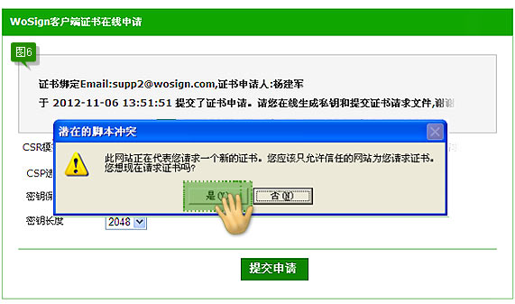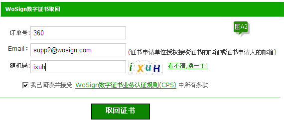 填入邮件中的“订单号”,Email,填入随机码,点选我已阅读并接受WoSign数字证书业务规则(CPS)中所有条款,最后点击“取回证书”,页面会弹出“潜在脚本冲突的提示框”,如下图A3页面所示: