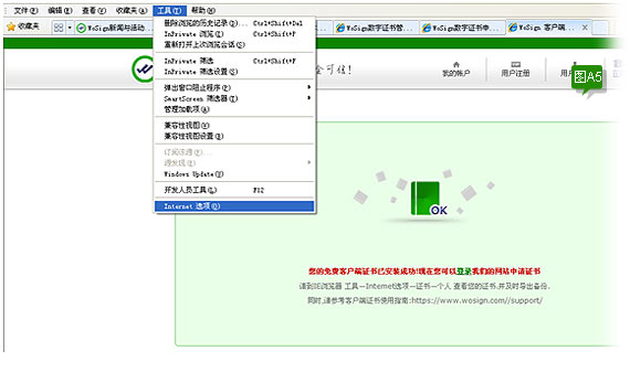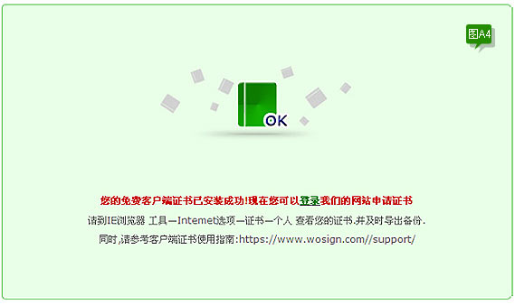 图A4此时表示证书已经被取回,并且已经被正确的安装在你IE浏览器中。此时建议您先不要做其他的操作,先对证书进行备份,备份操作如下: