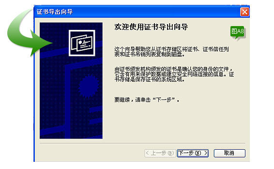如图选择您要备份的证书后,点击“导出”按钮。见下图A8所示: