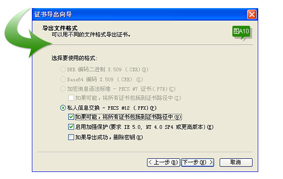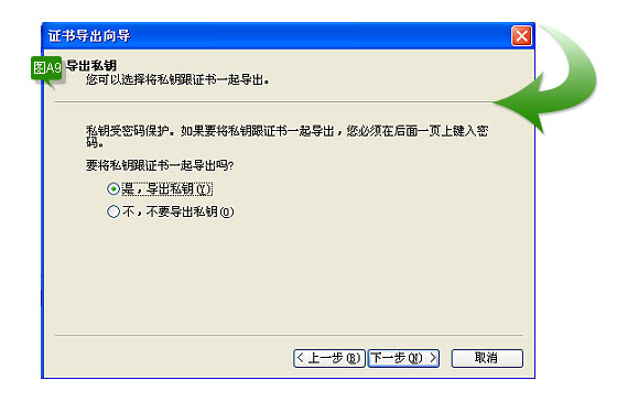 选择“是,导出私钥”,点击“下一步”,进入下图A10所示: