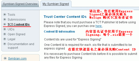 您从 WoSign 成功购买了发布者证书(TC Publisher ID)后就可以登录您的 Symbian Signed 帐户在线刷卡购买内容签名证书(TCT Content IDs)用于快速签名(Express Signed)。如下图1所示: