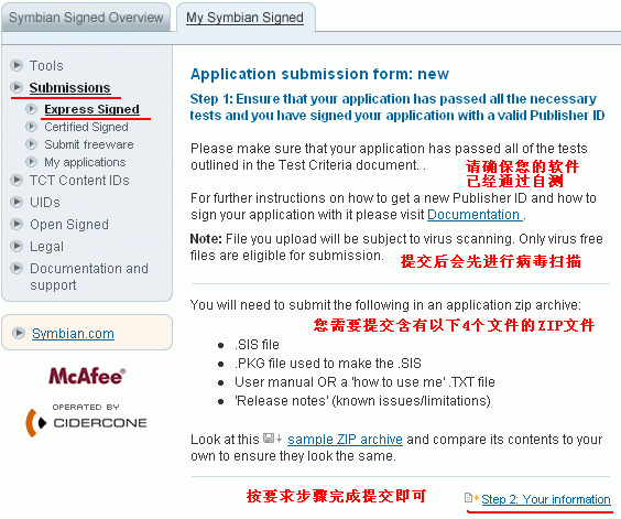 一旦成功购买内容签名证书(签名事件),您可以提交您的已经自测通过的、并已经使用发布者证书签名的.SIS文件到Symbian Signed 系统,如下图3所示,在主菜单"Submissions"中选中“Express Signed”,请参考: Symbian Signed 签名指南 把已经签名的.sis文件、.pkg文件和说明书等文件打包成.zip文件提交。