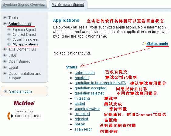 提交成功后,您就可以在"My applications"中看到您提交的文件的处理状态(Status),请根据不同的状态,采取不同的行动。 一旦状态为“Accepted”,则表明已经使用Content ID签名,可以取回发布使用了。请注意:成功重签名一次就减一次您购买的签名事件。