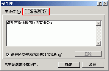 这表明此 Word 文件包含了宏,宏的作者为深圳市沃通通信服务有限公司,您可以点击“详细资料”来查看宏签名证书的详细信息。为了防止宏病毒,缺省情况下是不启用宏的,但您可以点击“永远信任来源于此的宏”,这样才会显示“启用宏”按钮,点击“启用宏”就正常进入此页面,就可以使用本文件自带的划表格的宏了。这时,点击“工具” - “宏” - “安全性”就能看到以后凡是此作者签名的宏都会直接信任,而不会出现图 2 所示的警告,如下图 3 所示: