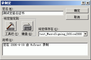 测试Word文件中录制了一个划表格的宏,只要选择“工具” - “宏” - “宏”,再选择宏名称“测试 WoSign 宏签名证书”后,点击“运行”就可以直接生成样板表格。当然,您在录制宏时,可以设置一个宏快捷键或工具栏按钮,以方便使用宏。