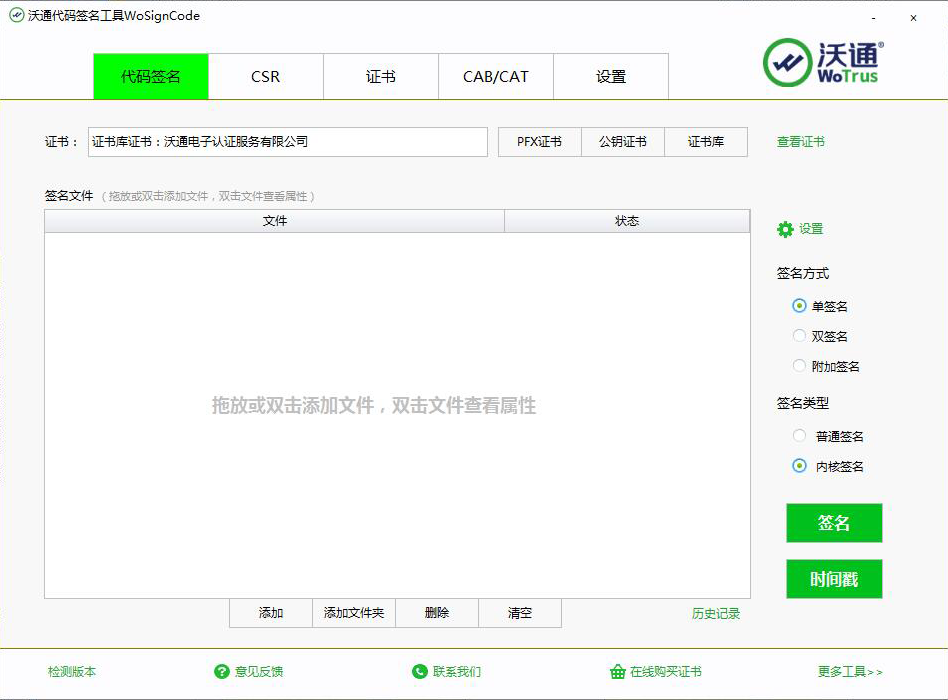 3. 沃通签名工具,支持对可执行文件(exe,dll,sys.ocx),等格式文件进行签名。windows 10内核.sys内核驱动请选择"内核签名",其它程序请选择"普通签名"。