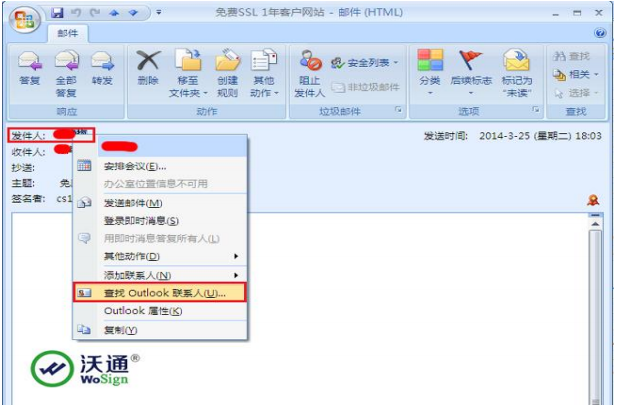 a)保存 B 邮箱的公钥文件 ,右键点击发件人(B 帐号),选择添加到 Outlook 联系人。