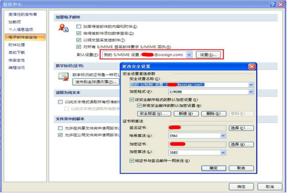 c) 在加密电子邮件下面, 点“设置”,出现“更改安全设置”对话框。单击“确定”接受默认值。如图下所示。