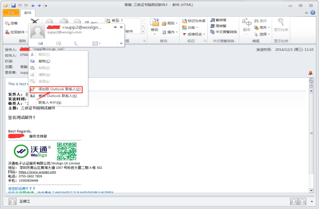 a)保存 B 邮箱的公钥文件 ,右键点击发件人(B 帐号),选择添加到 Outlook 联系人。