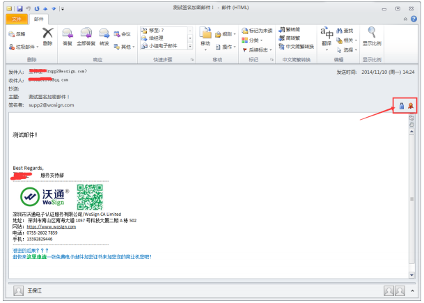 在B 帐号收件箱中找到该邮件,双击该邮件,看到签署者的右边有签名和加密的小锁标识;这样发送的邮件就是为加密邮件,只有 B 邮箱安装证书才可以查看发给他的加密邮件。