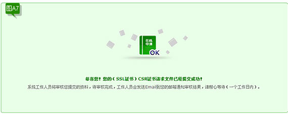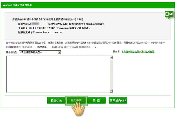 完成域名验证后,如图A6所示,选择服务器类型后,把CSR 粘贴到文本框,检查CSR是否正常,如果没有问题,点“提交申请” , 如果CSR有问题,或者还没有准备好,点“暂不提交CSR”,等准备好后,提交给客服专员。
