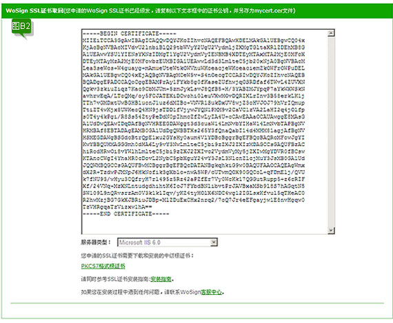 复制证书取回网站链接到IE浏览器中,如下图所示,请输入邮件中告知的订单号、证书申请单位授权邮箱,还有随机码,点击“取回证书”。如图B2所示,文本框中就是证书的公钥,请根据web服务器类型选择下载中级根证书;
