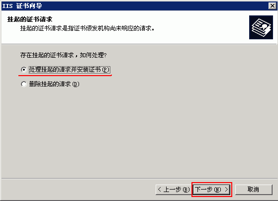 2. 处理挂起的请求 Select to “Process the pending request and Install the certificate.”