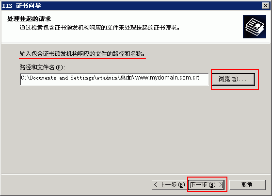 把您收到的证书文件:www.mydomain.com.crt 传到服务器上,并点击“浏览”选择该证书文件。