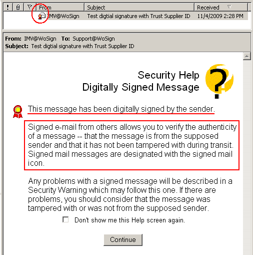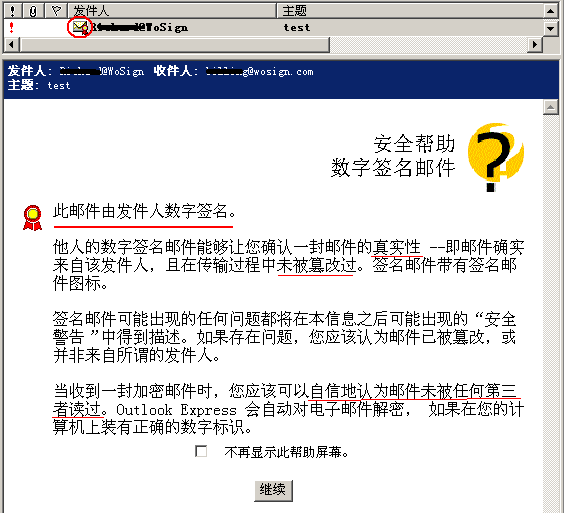 点击"Continue“,如图6所示,就会显示此邮件已经数字签名并且已经验证(Digital signed and verified),表明数字签名没有任何问题。