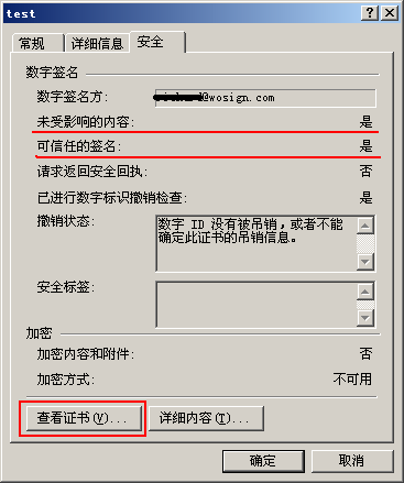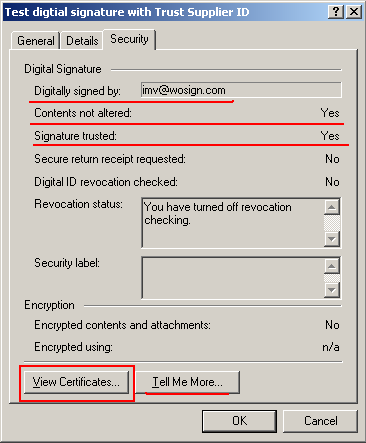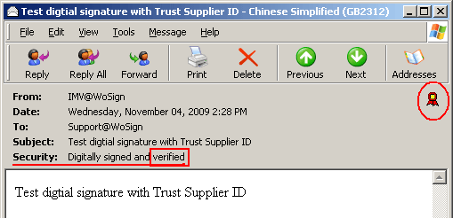 (4) 如上图 6 所示,在发件人的后面会显示一个红色的证书图标,点击证书图标后,就会显示详细的证书信息,如下图7所示,包括您的数字签名邮件帐号(Digitally signed by),邮件内容没有被篡改(Contents not altered),数字签名是可信的(Signature trusted)等。您的国外买家看到您使用Trust Supplier ID 数字签名的电子邮件时,一定会显示:Signature trusted:Yes ,这是由于通过微软Outlook Express的数字签名验证。相信您就不难理解为何”Trust Supplier ID“中文名称为”全球可信供应商认证证书“了。